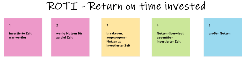 Und, zu guter Letzt, ist es auch wichtig den Wert von Meetings am Ende evaluieren zu lassen. Mit einer einfachen ROTI Abfrage (Return on time invested) lassen sich hier hervorragend Trends erkennen und besprechbar machen.